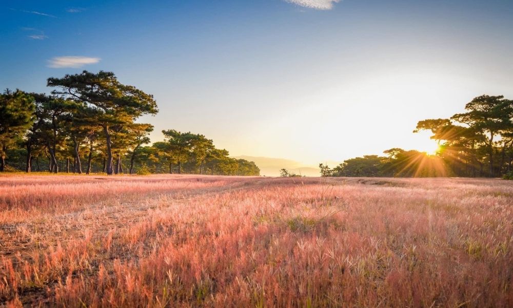 - Sắc màu quyến rũ: Vào mùa khô, đặc biệt là vào mùa đông, cảnh đồng cỏ chuyển sang màu hồng tím rực rỡ và lãng mạn. Đây là thời điểm lý tưởng nhất để bạn đến thăm và chiêm ngưỡng vẻ đẹp hút hồn của những đồi cỏ này. Màu hồng của cỏ không quá chói chang mà dịu nhẹ, mơ màng, tạo nên một không gian tựa như cổ tích giữa lòng Tây Nguyên.
