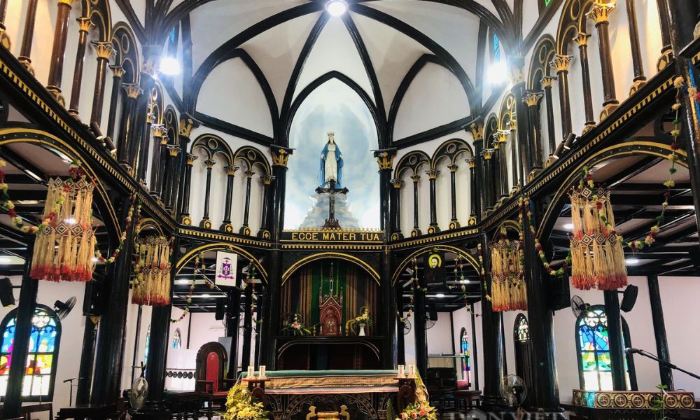 Mặt đứng của công trình mang bố cục đối xứng, với hình tháp vút cong lên đầy ấn tượng, được chia thành 4 tầng và có 4 mái tương ứng. Tầng trên cùng là tháp chuông cao 25 mét, sừng sững vươn lên giữa nền trời, với đỉnh là một cây thánh giá bằng gỗ quý, biểu tượng của đức tin. Tổng diện tích của toàn bộ công trình lên đến 1.228,8 mét vuông, đủ để thấy quy mô đồ sộ và tầm vóc của ngôi nhà thờ này. Mỗi chi tiết, từ đường nét kiến trúc đến vật liệu sử dụng, đều kể một câu chuyện về sự giao thoa văn hóa và tài năng sáng tạo của con người.