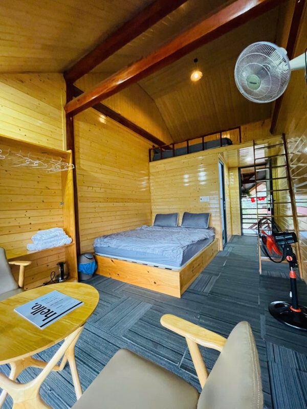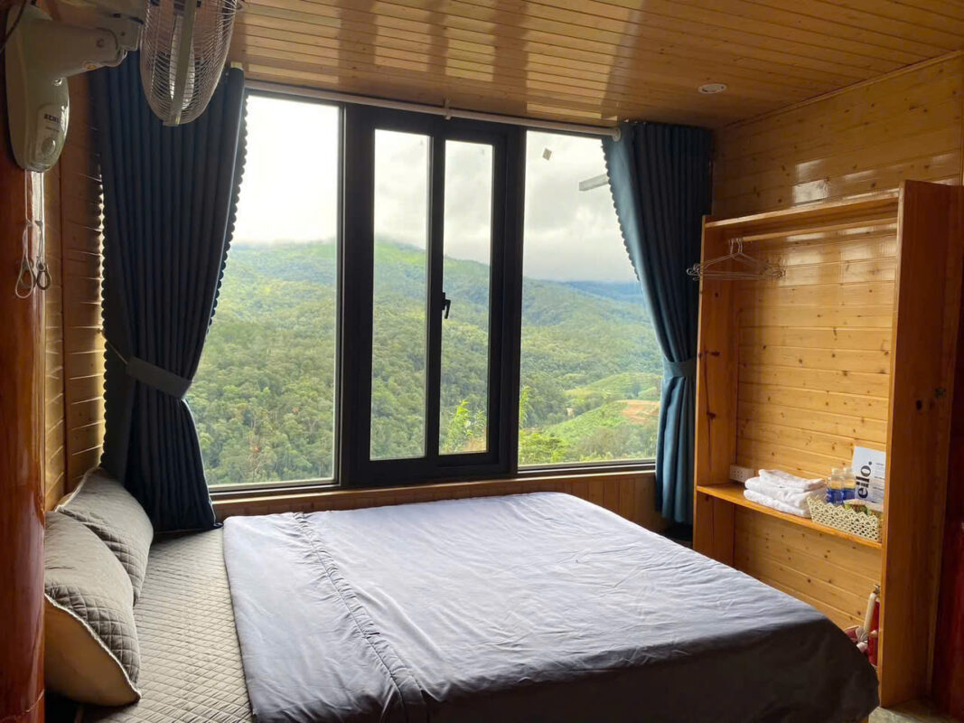 Ngoài không gian quán cà phê ấn tượng, Săn Mây Măng Đen Coffee & Homestay còn cung cấp các lựa chọn lưu trú vô cùng ấm cúng và gần gũi. Các phòng nghỉ tại đây được thiết kế đơn giản, mộc mạc nhưng vẫn đảm bảo đầy đủ tiện nghi cần thiết, mang đến sự thoải mái tối đa cho du khách. Mỗi phòng đều có phòng tắm riêng sạch sẽ, vòi sen và đặc biệt là tầm nhìn bao quát ra khung cảnh thiên nhiên hùng vĩ bên ngoài. Việc được đánh thức bởi tiếng chim hót, hít thở bầu không khí núi rừng trong lành và ngắm nhìn những hàng cây xanh mướt từ chính căn phòng của mình là một trải nghiệm khó quên, giúp bạn hoàn toàn hòa mình vào sự yên bình tuyệt đối. Từ homestay, du khách cũng có thể dễ dàng di chuyển để khám phá các điểm tham quan nổi tiếng của Măng Đen như Thác Pa Sỹ với dòng nước đổ trắng xóa hay lạc bước giữa những vườn hoa cẩm tú cầu rộng lớn, khoe sắc rực rỡ.