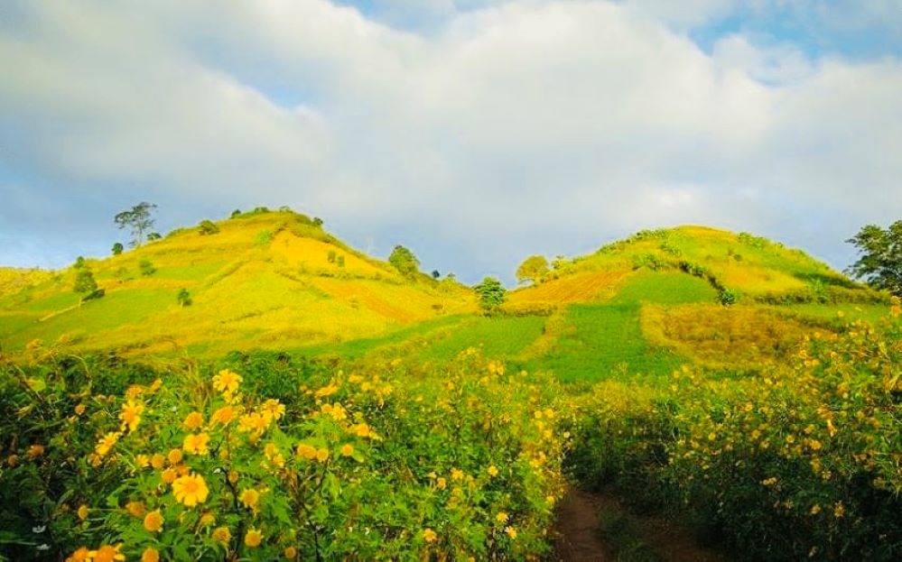 Núi lửa Chư Đăng Ya là một biểu tượng địa hình độc đáo của Gia Lai. Miệng núi lửa đã tắt từ hàng triệu năm trước, giờ đây biến thành một lòng chảo màu mỡ, được bao phủ bởi những cánh đồng hoa dã quỳ rực rỡ vào mùa khô. Khung cảnh nơi đây mang vẻ đẹp hoang sơ, hùng vĩ nhưng cũng không kém phần lãng mạn. Đứng trên đỉnh núi, bạn sẽ có cái nhìn bao quát về những nương rẫy xanh tươi và thảm hoa dã quỳ vàng óng, tạo nên những bức ảnh ấn tượng khó quên.